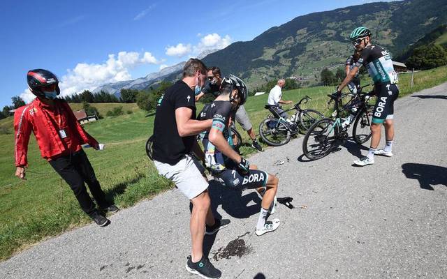 Buchmann got caught up in a spectacular mass crash which resulted in the stage being halted for 30 minutes shortly after leaving grado.